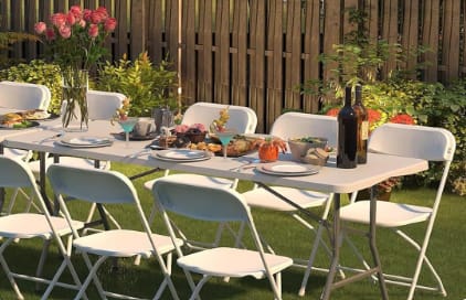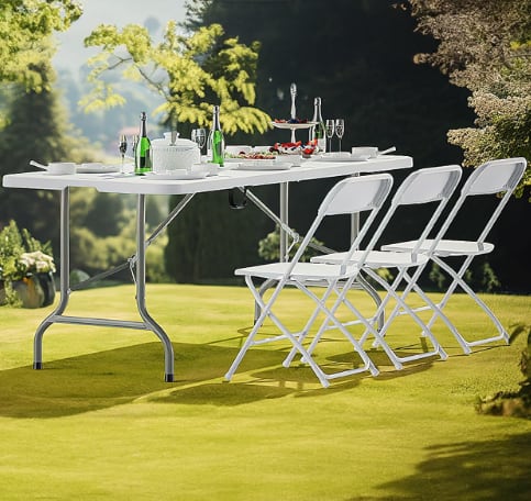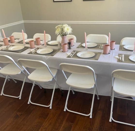 Measuring a generous 6 feet in length, this folding table comfortably seats 6 to 8 people when paired with our white folding chairs. Crafted with high-quality, heavy-duty plastic and robust metal legs, it delivers exceptional strength and stability, even during the busiest occasions. The smooth, easy-to-clean surface makes post-event cleanup a breeze, while the reinforced structure ensures longevity and consistent performance. We deliver, set up and take down after your event. 💪